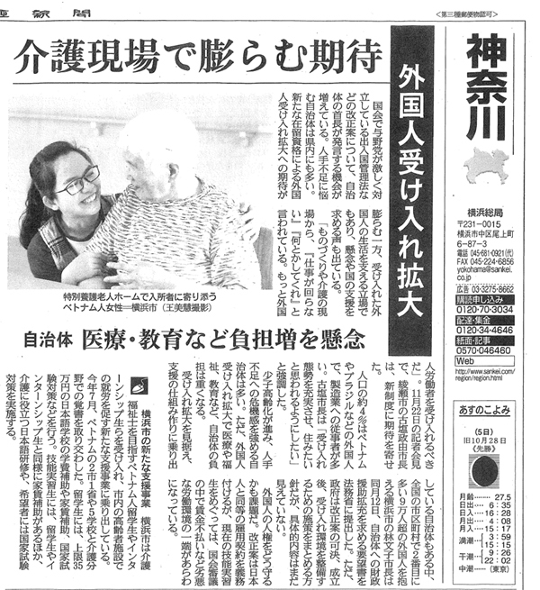 12月4日の産経新聞 神奈川県版に愛成苑の職員トゥイーさん(3F夢望)が掲載されました。
