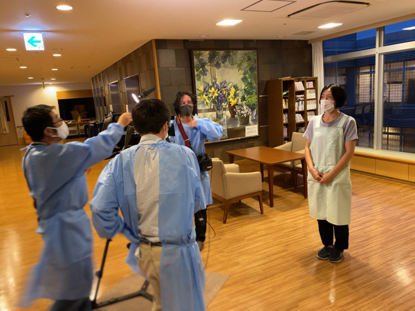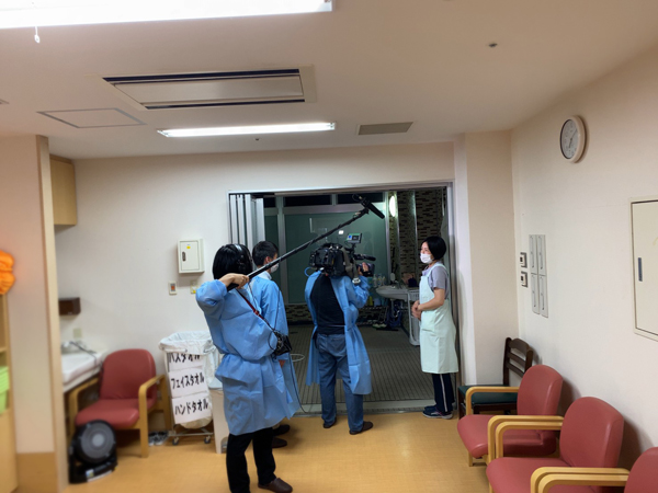 取材で入られた方には、検温・手洗いうがい・手指消毒をして頂き、清潔なマスク・不織布ガウンの着用をお願いしております。
